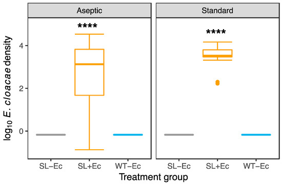 To test for the efficacy of our bacterial inoculation, and to investigate the presence or absence of contaminating bacteria in experimental treatments, whole insect larvae were homogenized and plated out to test for the presence of culturable bacteria. Inoculation with gut bacteria led to the effective colonization of insects, while uninoculated insects lacked any culturable gut microbes (Kruskal-Wallis tests—aseptic rearing, χ2 = 295, df = 2, p < 0.0001; standard rearing χ2 = 43.1, df = 2, p < 0.0001; Figure 1). Out of 96 larvae sampled in the SL+Ec treatment group, only two did not contain E. cloacae, while one larva contained another bacterial morphotype. In standard conditions, all sampled larvae (n = 8) showed 100% inoculation, and there were clear differences in bacterial densities between inoculated and uninoculated insects (Figure 1).