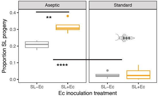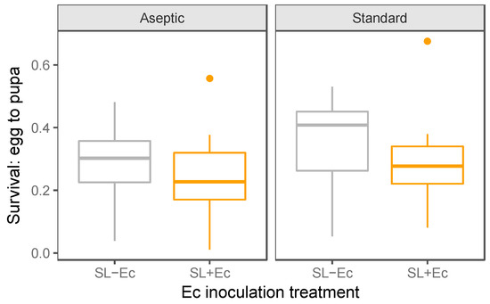 In standard conditions, E. cloacae exhibited slight parasitism in terms of reduced pupal weight in the presence of the E. cloacae, in agreement with previous studies of this E. cloacae in DBM [39]. The overall results suggest a condition-dependent mutualism between E. cloacae and SL males. In insects, host-bacteria interactions are well documented [27,28] and more specifically, symbioses can flip from parasitic to commensal or mutualistic according to environmental conditions, such as diet quality [39,40,41]. In this study, diet was initially sterile and consisted of the same components in aseptic and standard conditions. Even in our near aseptic rearing conditions (Figure 1), the presence of non-culturable bacteria can still occur, although it is relatively straightforward to exclude culturable microbes [22,42]. While we did not characterize the non-culturable community in these experiments, variation in abundance or community composition is a plausible cause of the impact of rearing conditions on adult fitness. The additional benefit of Ec inoculation could therefore arise from additional benefits in reducing the presence of pathogens or parasites [43].