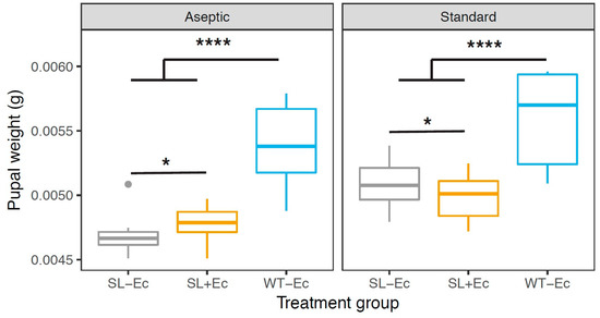 To test the hypothesis that E.cloacae would affect SL male growth, pupal weights were scored for inoculated SL insect (SL+Ec), uninoculated SL insects (SL−Ec), and uninoculated wildtype insects (WT−Ec) in aseptic and standard conditions. Insect genotype and inoculation treatment significantly affected pupal weight, with WT pupae having the greatest weight in both rearing regimes (GLM: F2,83 = 80.6, p < 0.0001). Rearing regime also affected weight; on average insects reared in standard conditions produced heavier pupae (GLM: F1,82 = 36.4, p < 0.0001; Figure 3). The effect of Ec inoculation, however, depended on rearing regime (GLM: inoculation × rearing interaction F2,80 = 3.51, p < 0.03; Figure 3). Under aseptic conditions, the gut bacteria marginally increased weight (post-hoc contrast, t = 2.34, p = 0.0217), while under standard conditions the gut bacteria appeared to be slightly parasitic and decreased pupal weight (post-hoc contrast, t = 2.28, p = 0.025). Overall, we confirmed a significant impact of Ec inoculation through model simplification; collapsing the Ec treatment groups for the self-limiting insects had a significant effect on pupal weight (GLM: F2,82 = 3.38, p < 0.038).