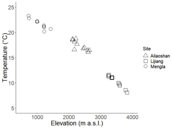 Three elevational transects were established in Yunnan Province, southwest China, approximately 300 km apart along a north-south bearing: tropical Mengla (21.6°N, 101.5°E), subtropical Ailaoshan (24.2°N, 101.2°E), and subalpine Lijiang (27.1°N, 100.2°E) (see [24] for detailed site descriptions). Yunnan Province covers a large latitudinal and elevational range (21.2–29.2°N, 76.4–6740 m above sea level or a.s.l.) and is located between three geographic areas with distinct bioclimatic conditions: the Tibetan Plateau, the tropical southern Asia and Indo-China monsoon region, and the eastern Asia monsoon region [25]. Two biodiversity “hotspots”, South-Central China and Indo-Burma, also cover large parts of Yunnan [26]. The three transects were established as part of the Queensland-Chinese Academy of Sciences Biotechnology Project [24], which aimed to investigate the elevational distribution of forest biodiversity. Each transect was divided into four elevational bands separated by 200 m intervals, starting at 800 m a.s.l. in Mengla, 2000 m a.s.l. in Ailaoshan, and 3200 m a.s.l. in Lijiang (Figure A1 in Appendix A). At each elevational band, we established five 20 m × 20 m sampling plots spaced at least 150 m from each other. Plots were situated away from areas with visible disturbances, such as canopy gaps.
