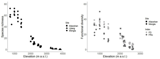 Taxonomic (left) and functional (right, showing FD in light grey and FRic in dark grey symbol) alpha diversity in Mengla (circle), Ailaoshan (square) and Lijiang (triangle) against actual elevation (in m a.s.l.), computed using species with eye length >0. Note the difference in x-axis values, as Lijiang was excluded from functional diversity analyses.