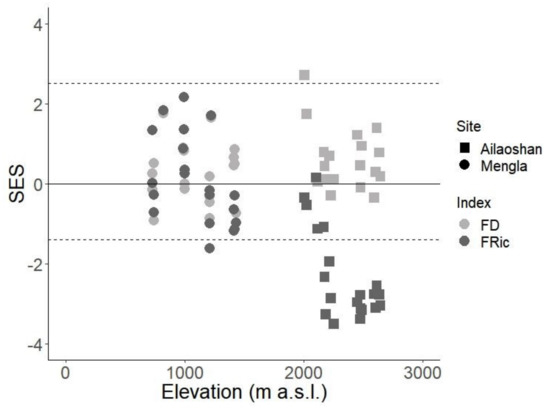 SES-FD and SES-FRic values in Mengla did not show distinct patterns, with only one plot having a significantly lower SES-FRic value from the mean expected value (Figure 3). In Ailaoshan, all plots found at the 2200, 2400, and 2600 m a.s.l. bands showed significantly lower SES-FRic values, while one plot in the 2000 m a.s.l. band showed a significantly high SES-FD value; all other SES-FD values as well as SES-FRic values from plots found in the 2000 m a.s.l. band did not differ significantly from expected.