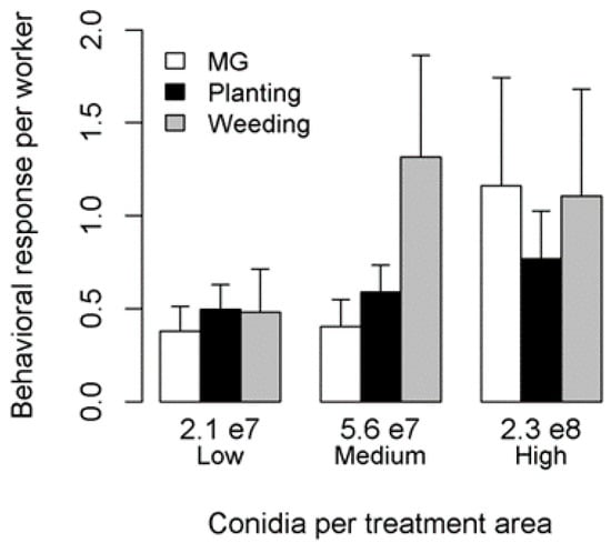 Ant workers’ behavioral response when exposed to three different Metarhizium brunneum conidia amounts. Error bars represent standard errors.