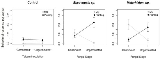 Mean ± standard errors frequencies of the hygienic behaviors metapleural gland (MG) grooming (MG: Grey dots) and fungal mutualist planting (black dots) exhibited by Trachymyrmex sp. 10 fungus-growing ants, in response to the germinated conidia or ungerminated conidia of the Escovopis and Metarhizium fungal parasites. Control treatments were talcum powder (for ungerminated conidia) or talcum powder contaminated by a fungal mutualist (for germinated conidia).