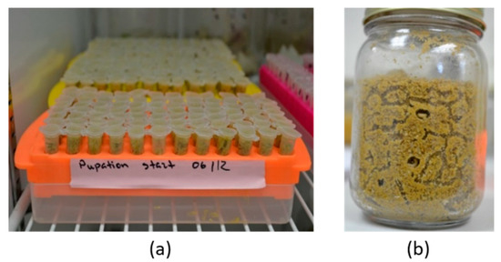 Small hive beetle (SHB) individual and mass pupation approaches: (a) tube trays containing Eppendorf tubes with individually pupating larvae; (b) a pupation jar containing 30 pupating larvae.