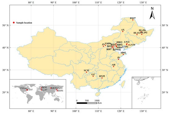 The collection sites of L. dispar. Populations labels follow those in Table 1 and Table S2. The collection locations of HLJ56 and HLJ79 populations are the same. The collection locations of LN79 and LN08 populations are the same. BJ79, BJ81 and BJ82 populations are collected in the same area.