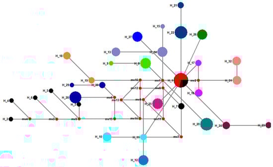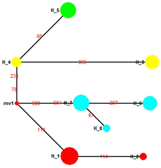 - Bandelt, H.J.; Forster, P.; Röhl, A. Median-joining networks for inferring intraspecific phylogenies. Mol. Biol. Evol. 1999, 16, 37–48. [Google Scholar] [CrossRef] [PubMed]