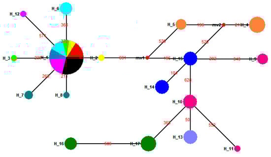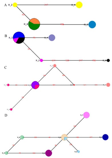 We investigated population structure in Hunan, Heilongjiang, Inner Mongolia and Greater Hinggan, based upon FST and Nm values, which are shown in Table S10. In the 1950s, these four geographical populations showed relatively high genetic differentiation, with values ranging from 0.8847 to 0.9356, and highly significant differences (p < 0.01) (Table S10). The Nm values among the four populations were <1 (0.0344–0.0652) (Table S10), which was consistent with their high levels of differentiation. In addition, eight haplotypes were identified for these populations in the 1950s (Figure 6).