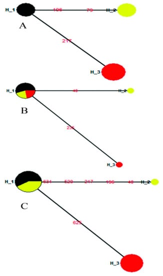 In addition, we analyzed the changes in genetic structure of three geographical populations across the three periods. For these three geographical populations sampled in 1979, mean FST, K, Hd and Pi were 0.9279, 1.3726, 0.6863 and 0.0021, respectively. The differences in FST values among the three populations were significant (p < 0.05, Table S7), with no evidence of a shared haplotype in 1979 (Figure 5A). In 1992, mean FST, K, HD and Pi were 0.4309, 0.3636, 0.3455 and 0.0006. FST values between the BJ92 population and both the HLJ92 and LN92 populations were not significant (p > 0.05, Table S8) and shared one haplotype (Figure 5B). For 2011, the three populations exhibited means of 0.5496, 0.9610, 0.5584 and 0.0015, respectively; the HLJ12 and LN11 populations showed not significantly difference in terms of FST (p > 0.05, Table S9), with one shared haplotype between two populations (Figure 5C).