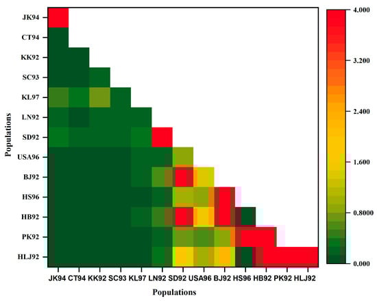 A heat map reflecting the gene flow between populations. It is not possible to clearly show the gene flow between all populations in the heatmap due to the large difference in Nm values between populations (0–63). Moreover, it indicates that the degree of gene flow between populations is strong when Nm > 4. Therefore, we set gene flow values (Nm) to 4 when Nm > 4 in the heatmap.