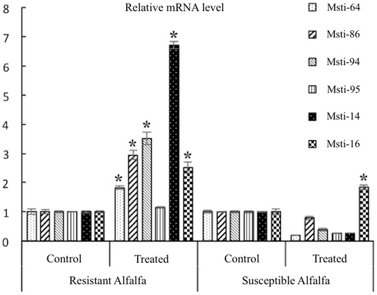 RT-qPCR analysis confirmed that the six selected differentially expressed genes (DEGs)—i.e., Kunitz-type trypsin inhibitor (Msti-64); Serine proteinase inhibitor (Msti-86); Kunitz-type trypsin inhibitor-like 2 protein (Msti-94); Kunitz-type trypsin inhibitor/Alpha-fucosidase (Msti-95); and alpha-amylase/subtilisin inhibitor (Msti-14)—had consistent expressions in a manner similar to that obtained by transcriptomes at the transcriptional level. Gene expressions were up-regulated in the resistant alfalfa variety (cv. Zhongmu-1) after feeding by the aphids, whilst the expressions were down-regulated in the sensitive variety of alfalfa (cv. WL323). The level of gene expression was significantly (p ≤ 0.05) higher in the treatments with aphids as compared to the treatment without aphids (Figure 2). Similarly, the expression was significantly higher in the resistant varieties of alfalfa as compared to the susceptible varieties.