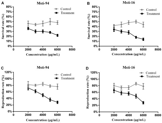The survival rates of the aphids after 72 h at different concentrations of feeding with Msti-94 (A); survival rates of the aphids after 72 h at different concentrations of feeding with Msti-16 (B); reproduction rates of the aphids after 72 h at different concentrations of feeding with Msti-94 (C); the reproduction rates of the aphids after 72 h at different concentrations of feeding with Msti-16 (D). Control refers to the artificial feed without any inhibitors (non-induced bacterial sample), and treatment refers to the artificial feed with inhibitors.