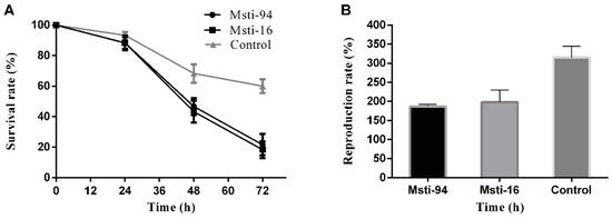Control had artificial feed without any inhibitors (non-induced bacterial sample) (A) The survival rate of aphids fed for 72 h with Msti, with a treated dose of 800 μg/mL purified protein; (B) reproduction rate of aphids fed for 72 h with Msti, with a treated dose of 800 μg/mL purified protein. The reproduction rate of the aphids was higher than 100% because of parthenogenesis and overlapping generations.