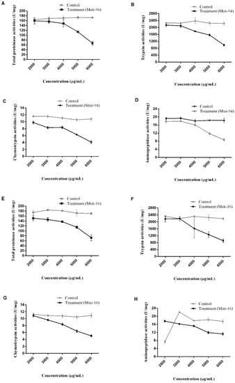 Activities of the four selected enzymes treated with different concentrations of Msti-94 and Msti-16 added to the artificial feed along with the control. Total proteinase vs. Msti-94 (A); trypsin vs. Msti-94 (B); chymotrypsin vs. Msti-94 (C); aminopeptidase vs. Msti-94 (D); proteinase vs. Msti-16 (E); trypsin vs. Msti-16 (F); chymotrypsin vs. Msti-16 (G); aminopeptidase vs. Msti-16 (H). The calculation method of the enzyme activity is based on the international calculation formula, and an enzyme activity unit (U) is defined as the reduction or production of 1 μmol substrate in 1 min. Control refers to the group with the artificial feed without any inhibitors (non-induced bacterial sample), and treatment refers to the artificial feed with inhibitors.