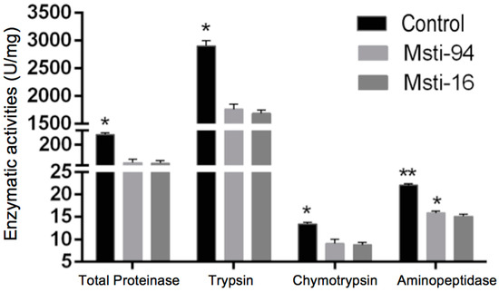 Enzyme activities of the four protease in aphids treated with Msti along with the control. Msti-94/Msti-16: the recombinant purified protein of Msti at a concentration of 800 μg/mL was used to feed the aphids. Control: the artificial feed was used to feed the aphids. *, ** represents the level of significance at 5% and 10%, respectively.