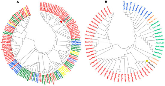 Phylogenetic analysis of Tektin, and Tssk gene family of B. dorsalis and different insect species. I41 proteins of Tssk and 63 proteins of Tektin family were analyzed. Different colors indicate different orders of insects. Black color indicates B. dorsalis (A) mehroon (Diptera), blue (Coloeopltera), yellow (Lepidoptera), green (Hymenoptera), purple (Siphonaptera), and red (Blattodae). (B) Mehroon (Diptera), green (Hymenoptera), blue (Lepidopters), and orange (Coleoptera). Names of different insects are Aaeg (Aedes aegypti), Acer (Apis cerana), Agla (Anoplophora glabripennis), Amel (Apis mellifera), Apla (Agrilus planipennis), Aroz (Athalia rosae), Aver (Asbolus verrucosus), Bdor (Bactrocera dorsalis), Bimp (Bombus impatiens), Blat (Bactrocera latifrons), Bole (Bactrocera olea), Bter (Bombus terrestris), Bmor (Bombyx mori), Ccal (Ceratina calcarata), Ccap (Ceratitis capitata), Ccin (Cephus cinctus), Ccos (Cyphomyrmex costatus), Cfel (Ctenocephalides felis), Cflo (Camponotus floridanus) Clec (Cimex lectularius), Csec (Cryptotermes secundus), Dall (Diachasma alloeum), Dbip (Drosophila bipectinata), Dbus (Drosophila busckii), Dele (Drosophila elegans), Dere (Drosophila erecta), Deug (Drosophila eugracilis), Dfic (Drosophila ficusphila), Dgua (Drosophila guanche), Dhyd (Drosophila hydei), Dkik (Drosophila kikkawai), Dmir (Drosophila miranda), Dnav (Drosophila navojoa), Dobs (Drosophila obscura), Dqua (Drosophila guanche), Dnov (Dufourea novaeangliae), Drho (Drosophila rhopaloa), Dser (Drosophila serrata), Dsuz (Drosophila suzukii, Dtak (Drosophila takahashii), Dwil (Drosophila willistoni), Dobs (Drosophila obscura), Dpon (Dendroctonus ponderosae), Dser (Drosophila serrata), Dnav (Drosophila navojoa), Dalb (Aedes albopictus), Deug (Drosophila eugracilis), Dbia (Drosophila biarmipes), Emex (Eufriesea mexicana), Fari (Fopius arisanus), Harm (Helicoverpa armigera), Hlab (Habropoda laboriosa), Lcup (Lucilia cuprina), Mdem (Microplitis demolitor), Ldec (Leptinotarsa decemlineata), Mdom (Musca domestica), Mrot (Megachile rotundata), Mpha (Monomorium pharaonis), Nlec (Neodiprion lecontei), Nvit (Nasonia vitripennis), Nlug (Nilaparvata lugens), Nves (Nicrophorus vespilloides), Oabi (Orussus abietinus), Otau (Onthophagus taurus) Prap (Pieris rapae), Pcan (Polistes canadensis), Pdom (Polistes dominula), Pgra (Pseudomyrmex gracilis), Scal (Stomoxys calcitrans) Slit (Spodoptera litura), Tcas (Tribolium castaneum), Vtam (Vanessa tameamea), Tni (Trichoplusia ni), Waur (Wasmannia auropunctata), and Zcuc (Zeugodacus cucurbitae). Neighborhood joining method along with 1000 bootstraps was used to construct the tree.