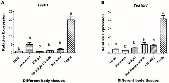 Expression profiles of Tssk1 and Tektin1 were also investigated in different body tissues of the male adults of B. dorsalis. qRT-PCR results indicated that Tssk1 and Tektin1 were expressed in all body tissues, but their expression was much higher in testis than in other tissues (Figure 3A,B).