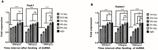 The highest expression of Tssk1 and Tektin1 in the testis of male adults indicated their important functions in male fertility. Therefore, knockdown experiments using RNAi were carried out to investigate the functions of these two genes (Tssk1 and Tektin1) in the male fertility of B. dorsalis. Real-time PCR (qRT-PCR) analysis was performed after oral feeding of dsRNA of Tssk1 and Tektin1 genes for 6 h on newly emerged male adults. The results showed successful delivery of dsRNA, as evidenced by the fold change in the gene expression. Fold change in the gene expression was measured for five consecutive days. The results showed that highest down-regulation effect was found in the 1st day with the feeding of dsTssk1 at concentrations of 500 ng/μL, 700 ng/ΜL, and 1000 ng/μL, which was about 31%, 50%, and 62%, respectively (Figure 4A). With the feeding of dsTektin1 at concentrations of 500 ng/μL, 700 ng/ μL, and 1000 ng/μL, maximum downregulation in the gene transcription was also found on the first day, at approximately 33%, 50%, and 71%, respectively (Figure 4B).