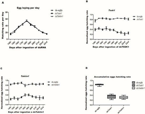 To investigate the effects of gene silencing of Tssk1 and Tektin1 on the reproductive capacity of male flies of B. dorsalis and daily numbers of eggs laid, hatching assays were carried out. Results indicated that there was no significant difference in the numbers of eggs laid between dsRNA feeding of target genes and control (ds-egfp) group (Figure 6A). The same genes (Tssk1 and Tektin1) were chosen, and the effect of the dsRNA feeding on male fertility was analyzed. The target genes exhibited significant impact on the hatching rate of eggs. Sterility in Tssk1 and Tektin1 knockdown males was observed up to 58.99% and 64.49%, respectively, compared to the control (ds-egfp) group (Figure 6B,C).