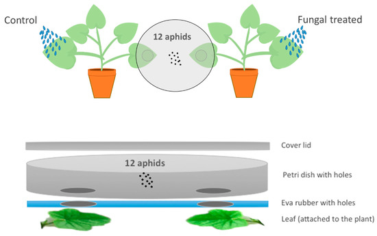 Design of an experimental arena for the choice bioassay. The set-up consists of one large Petri dish (150 mm × 15 mm) with two holes (diameter 25 mm each) in the bottom and covered by the lid. The area in contact with the plant was lined with eva rubber to avoid damaging the leaves. Aphids could choose between an unsprayed but endophytically-colonized leaf and a leaf from the control plant, or they could remain in the neutral area (no choice). The final position (endophytically-colonized leaf, control leaf, or neutral area) was recorded.