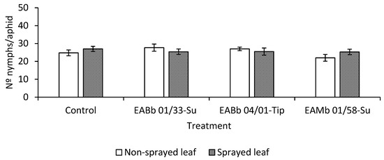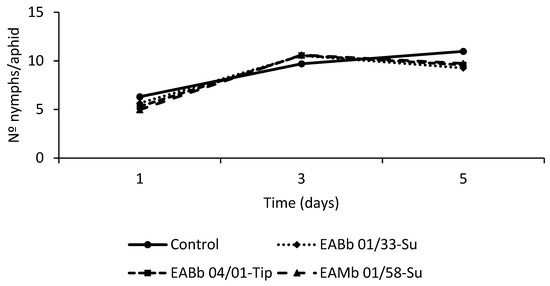 Nonetheless, although fecundity was accelerated, this did not result in an overall increase in the aphid population compared with the control (Figure 4). At the end of the assay (day 5), aphids feeding on endophytically-colonized leaves laid, in general, fewer nymphs than ones feeding on control plants. This was particularly apparent in aphids feeding on leaves endophytically-colonized by isolate EAMa 01/58-Su (t 103 = −2.49; p = 0.04).