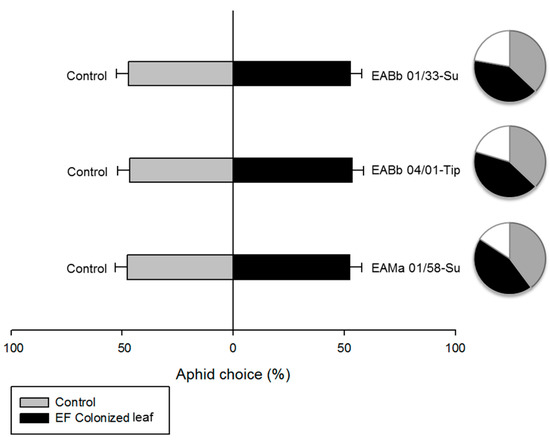 Endophytic colonization of leaves by entomopathogenic fungi did not influence host plant selection by aphids (Figure 5). There were no significant differences in the number of aphids on control and endophytically-colonized leaves when the aphids were offered a choice between the two, and this was consistent for all isolates either in the analyses by experiment (χ2 1; p > 0.05) or in the analyses with the experiments combined: EABb 01/33-Su (likelihood ratio test χ2 1 = 0.19; p = 0.66); EABb 04/01-Tip (likelihood ratio test χ2 1 = 0.41; p = 0.52); EAMb 01/58-Su (likelihood ratio test χ2 1 = 0.27; p = 0.60).