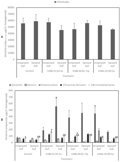 Aldehydes (A) and alcohols, ketones, hydrocarbons, terpenoid and phenolic derivatives (B) (Mean ± SE, from the two trials) emitted by melon leaves from different treatments (unsprayed leaves and sprayed leaves) in control and inoculated plants by different isolates: EABb 01/33-Su, EABb 04/01-Tip and EAMa 01/58-Su. Statistically significant differences were determined using the LSD (α = 0.05).