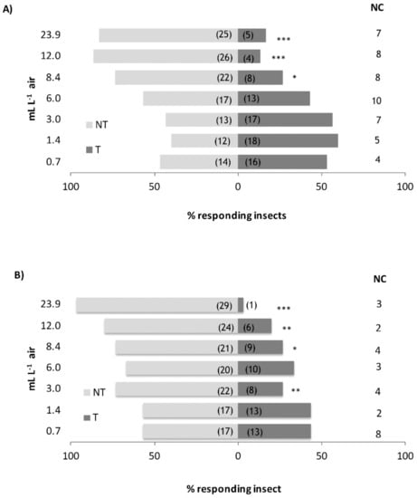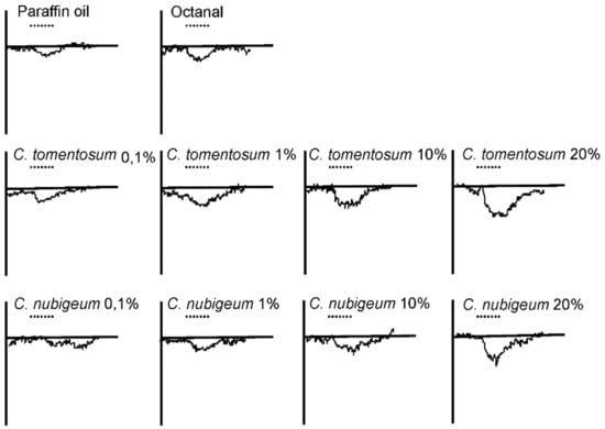 - Pophof, B.; Stange, G.; Abrell, L. Volatile organic compounds as signals in a plant-herbivore system: Electrophysiological responses in olfactory sensilla of the moth Cactoblastis cactorum. Chem. Senses 2005, 30, 51–68. [Google Scholar] [CrossRef] [PubMed]