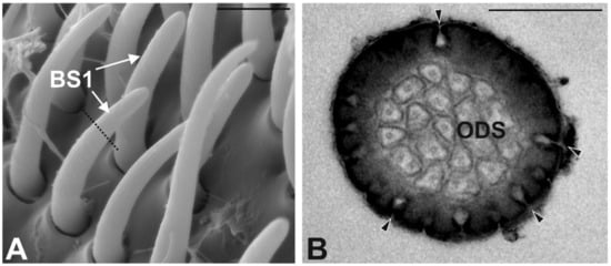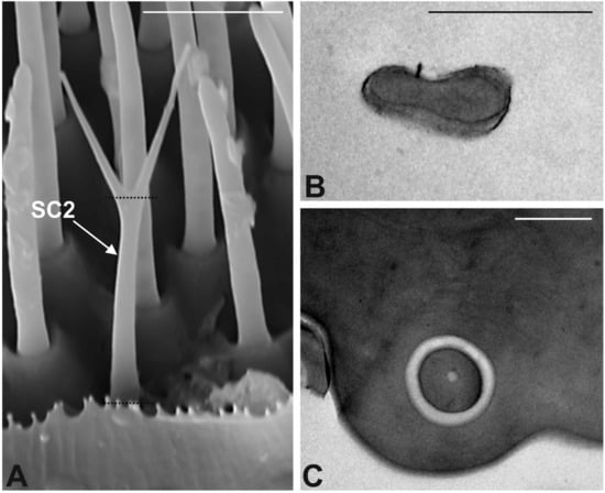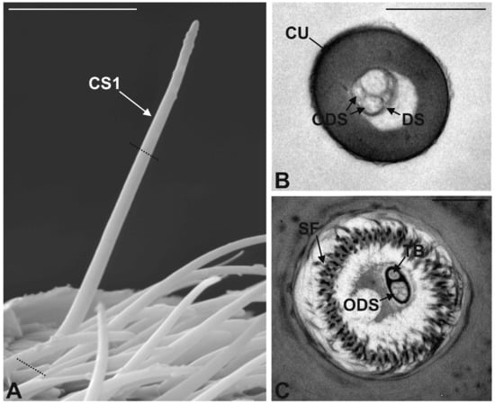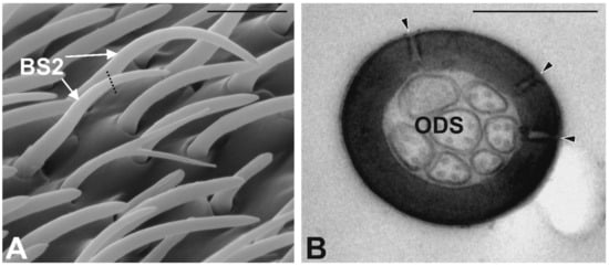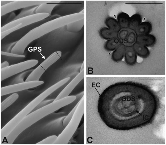 - Graffal, K.P. An ultrastructural study of the tips of four classical bimodal sensilla with one mechanosensitive and several chemosensitive receptor cells. Zoomorphology 1979, 92, 273–291. [Google Scholar] [CrossRef]