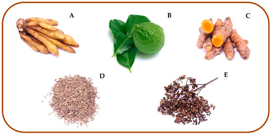 Five species of plants, including finger root, Boesenbergia rotunda (root); kaffir lime, C. hystrix (fruit); turmeric, Curcuma longa (root); caraway, Ocimum gratissimum (seed) and szetchwan pepper, Zanthoxylum limonella (seed) (Figure 1) were purchased from a herb stores in Chiang Mai province, Thailand, and identified by a plant taxonomist at the Department of Pharmaceutical Sciences, Faculty of Pharmacy, Chiang Mai University, Thailand. Voucher specimens were deposited at the Department of Parasitology, Faculty of Medicine, Chiang Mai University.