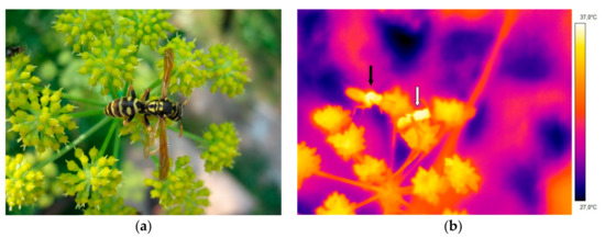 To take into consideration the effects of ambient air temperature, solar radiation, and air convection of the measurement site on the wasps’ body temperature, we determined the insects’ thermal environment, expressed in terms of the operative (environmental) temperature (Te). The operative temperature is the temperature of an object with the same external (e.g., size, shape, and color) and internal characteristics as the animal under consideration; it integrates convective and radiative heat transfer between the environment and the animal [1,15,16,17,18]. The use of fresh insect carcasses is highly recommended in such studies, because they represent the passive reaction to environmental conditions much better than dried specimens [1,19]. In our study, a dead wasp was used as an operative temperature thermometer. For this purpose, a wasp was caught and killed by freezing. The defrosted wasp was attached to the center of the flowers’ inflorescence in a natural foraging position, as shown in Figure 1a. The body surface temperature of the dead wasp was measured by infrared thermography (see above) and the ambient temperature (Ta) was measured 1 cm beside the wasp, as shown in Figure 1b. The dead wasp was measured simultaneously or in alternation with the living foraging wasps. With this model, we were able to quantify the part of temperature increase generated by endothermic heat production of the living wasps.