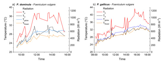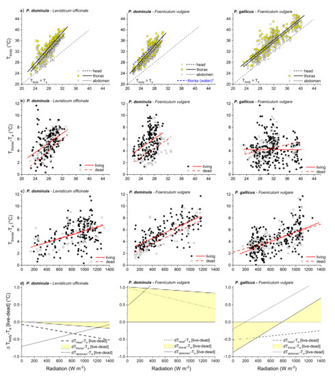 The following are available online at https://www.mdpi.com/2075-4450/10/7/187/s1. Figure S1: Temperature and radiation conditions during foraging of Polistes dominula and Polistes gallicus on lovage and fennel. Ta increased with radiation intensity. Figure S2: Thorax temperature excess of foraging Polistes dominula and Polistes gallicus on lovage and fennel according to different radiation categories. Figure S3: Thorax temperature excess of living (a) and dead (b) Polistes dominula and Polistes gallicus on lovage and fennel. A model calculation including both environmental parameters, i.e., Tth-Ta = A + B1*Ta + B2*Radiation, revealed that radiation contributed the main part to this temperature increase (Figure S3; Table S3). Black symbols represent measured values and red symbols represent the model results for radiation-corrected values. For statistical details see Supplementary Table S3. Table S1: Statistical details of the correlation between the microclimate data (Ta, ambient temperature; Tflower, temperature in inflorescence; Tglobe, temperature weather station and radiation) and the operative temperature model (Te), given is R2/P/N. Table S2: Statistical details and the fit parameters of linear regressions of all body parts and species. Table S3: Summary of multifactorial ANOVA statistics for the thorax temperature excess (Tth-Ta) in Figure 3b.