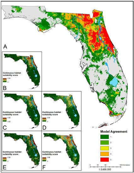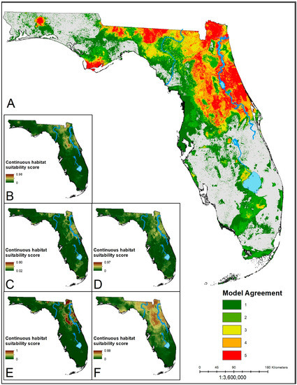 Estimated habitat suitability for each species was determined by applying the optimized algorithms to a set of raster variables. The output is a probability surface for the entire mainland portion of the state, representing the probability that the conditions in a given raster cell are suitable for each species. These probability surfaces were reclassified as suitable or unsuitable based on a specified threshold criterion for prediction accuracy (sensitivity = specificity). This threshold criterion was selected as a tradeoff between predicting true positives and true negatives. The ensemble prediction of the distribution of suitable habitat for each species is the agreement between models and was assessed by summing the binary suitability estimates for each method. Thus, suitability was based on a consensus score ranging from 0–5 ranking how many of the algorithms indicated a given location was suitable or not. We also retained the continuous probability estimates for each optimized model to visualize single model variation from the ensemble prediction.