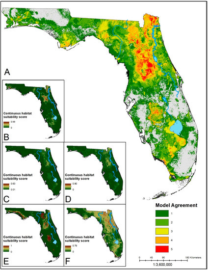 Variables describing NDVI, elevation, soil, and geomorphologic characteristics were derived from MODIS NDVI 16-day composites, ASTER Global DEM, STATSGO soils database and national hydrography datasets, respectively [41,42,43,44]. The land cover classification was derived from the Florida Cooperative Land Cover database, which includes statewide classifications of all major land cover types at a native resolution of 10 m [45]. The database represents a hierarchical classification. The primary state-level land cover types were aggregated using a majority rule to the coarsest level as one of five primary types: Forest, which included pine and hardwoods; shrub, which encompassed shrub and brush lands; grasslands; wetlands; and a final, general category including all other land types such as water bodies, urban areas, and seasonal agriculture. All environmental predictors were resampled using bilinear interpolation for continuous variables and majority rule for categorical variables and cropped to the same extent and 1 ha resolution.