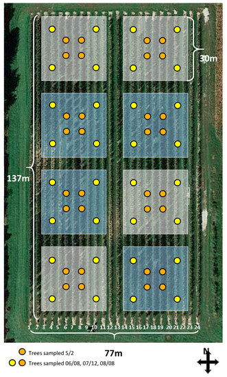 Plot plan of the SSCDS orchard installation. Blue shaded squares denote SSCDS sprayed plots, white squares are airblast plots. Yellow and orange markers are the approximate location of sampled trees.