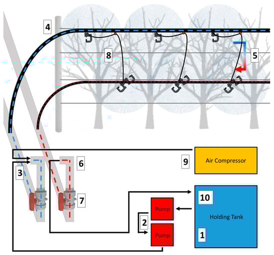 The equipment used in our experiment consisted of a SSCDS comprised of a canopy delivery system and a hydraulic/pneumatic pumping station and a radial fan airblast sprayer (Figure 2). The canopy delivery system was comprised of upper (2.5 cm) and lower (1.9 cm) Blue Stripe® Poly Tubing polyethylene hoses (The Toro Company, Bloomington, MN, USA). Hoses formed a continuous loop, with the 2.5 cm line attached at 2.6 m high with the 1.9 cm line returning at 1.2 m high (Figure 2). The microsprinklers used in this study were Hadar 7110 series microsprinklers with ‘black’ 0.08 mm nozzles and ‘yellow star’ static spreaders (NaanDanJain Irrigation Ltd., Na’an, Israel). Individual components were fit together with bayonet style attachments, to prevent decoupling over the course of multiple duty cycles. An array of three microsprinklers were attached with 6.35 mm diameter tubing to a 240 kPa Leak Prevention Device (LPD) inserted into the upper delivery line (Figure 3). Each array of three microsprinklers consisted of a single microsprinkler attached to upper delivery line (2.6 m) and a pair of microsprinklers positioned at 1.2 m. The top microsprinkler was attached to the upper delivery line using a hose clip with a horizontal pillar that held the microsprinkler perpendicular to the row with microsprinklers spaced at 0.9 m intervals. The lower pairs of microsprinklers were mounted to a ‘T’ fitting and were spaced 0.9 m apart (Figure 3). The emitters on the top and bottom lines were offset such that they fell in between the two emitters in the opposing strata (Figure 2).