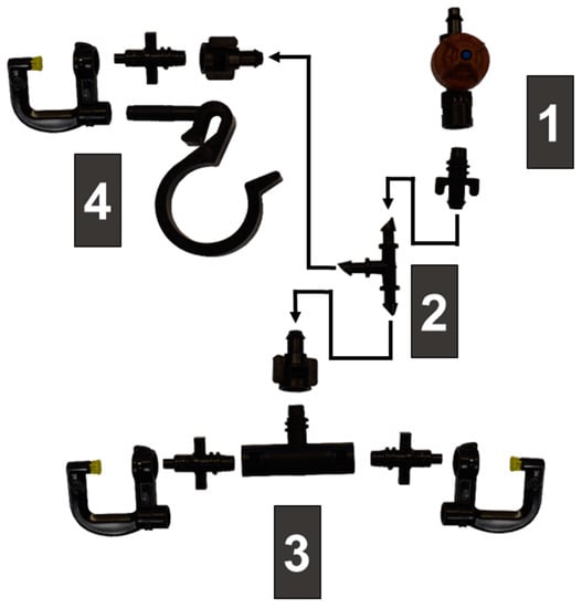 Microsprinkler components for a set of sprayers. (1) 241 kPa Leak prevention device that is inserted into 2.5 cm upper line with bayonet adapter to 0.635 cm line. (2) 3 way split inserted into 0.635 cm line. (3) ‘T’ bayonet fitting attached to a pair of 0.8 mm nozzles and Hadar 7110 spray deflectors. (4) Single microsprinkler fixed to post on hose/wire clip.