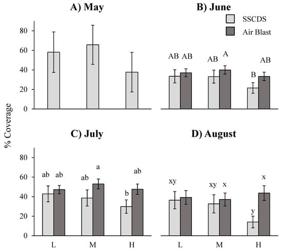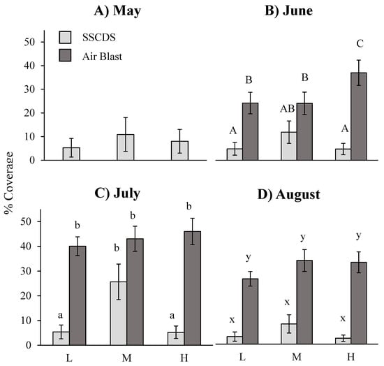 Least square means of the percent abaxial coverage (cm2). Means shown for each of the sampled dates (A) 5/2/16, (B) 6/8/16, (C) 7/12/16, and (D) 8/8/16 and heights (L = 0.7 m, M = 1.4 m, H = 2.1 m). Error bars indicate (Tukey-Kramer) 95% confidence intervals. Different letters within a month indicate significant differences among bars within a month. No significant differences were detected in May (SSCDS system only).