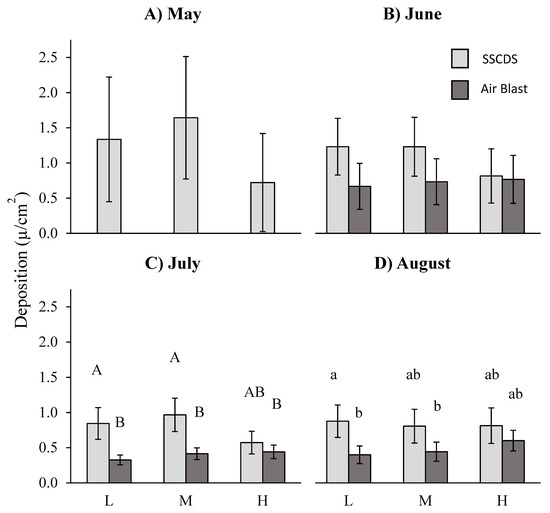 Least square means of deposition of tartrazine dye (µg/cm2). Means shown for each of the sampled dates (A) 5/2/16, (B) 6/8/16, (C) 7/12/16, and (D) 8/8/16 and heights (L = 0.7 m, M = 1.4 m, H = 2.1 m). Error bars indicate (Tukey-Kramer) 95% confidence intervals. Different letters within a month indicate significant differences among bars within a month. No significant differences were detected in May and June.