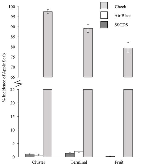 Observed percent incidence of apple scab in each tissue type. Mean incidence shown from the airblast and SSCDS treated plots, with a comparison check from a nearby untreated orchard (Check not included in statistical analysis). Error bars indicate standard error of the proportion.