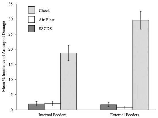 Mean percent incidence of arthropod damage on fruit. Mean incidence shown from the airblast and SSCDS treated plots, with a comparison check from a nearby untreated orchard (Check not included in statistical analysis). Error bars indicate standard error of the proportion.