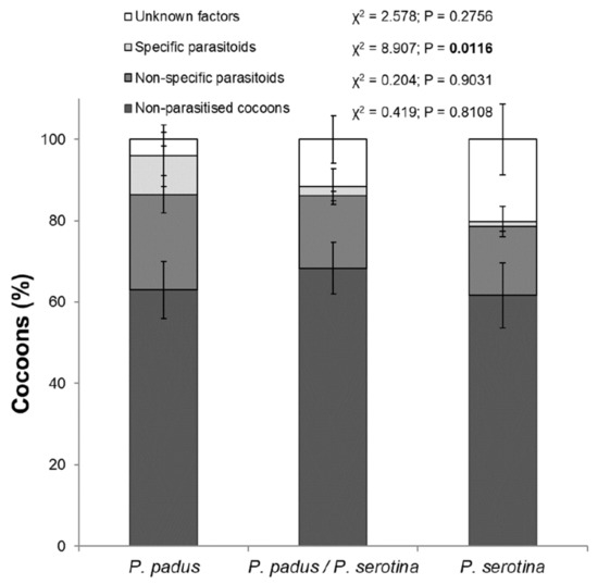 Mortality of pupal Yponomeuta evonymella feeding on Prunus padus, P. serotina or a mix of the two shrub species. Graph shows percentage of collected cocoons (means ± SD) parasitised by specific and non-specific parasitoids, killed by unknown factors, or unparasitised.