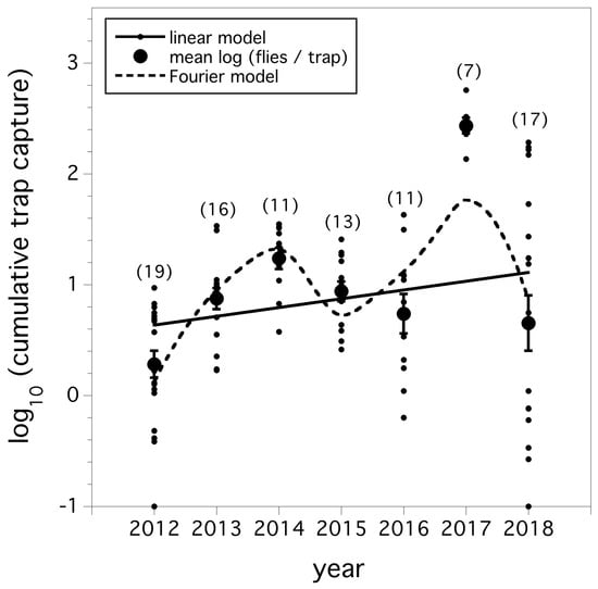 First, to determine if logarithm of annual fly captures per trap over the season (using standardized growing season of 705 DD as length of season) increased linearly or nonlinearly over time or were characterized by periodicity (2012–2018), we fit the following models for testing this hypothesis: (1) a linear generalized model (Gaussian error) using maximum likelihood and year as the independent variable; (2) non-linear generalized model, polynomial in form (fourth order) regression; (3) a penalized piece-wise spline regression (to prevent over-fitting of the data); and (4) a Fourier sine/cosine non-linear model [42]. The piece-wise spline and the Fourier models were fit to the time series data using a generalized mixed model where the spline or Fourier coefficients are treated as random effects estimated as best linear unbiased predictors [42]. Visual inspection of model residuals compared to model predictions and AICc (Akaike information criterion corrected for small sample sizes) were used to provide evidence for selection of a model that would best support either a linear increase or the non-linear alternative models representing periodic or oscillatory dynamics. In addition, we tested if the alternative non-linear models significantly reduced the unexplained variance in the base linear model by comparing the model deviances (−2 log likelihood statistics) of the non-linear models to the base linear model with the Chi-square distribution.