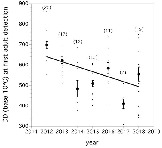 We found that over the seven year invasion period, first captures of flies occurred earlier, measured in degree days, each year (F(1, 99) = 19.939, p < 0.0001, r 2 = 0.168). This decline has a slope of −82.8 degree-days per year. The trend in the degree days at first detection of adults between 2012 and 2018 is shown in Figure 3.