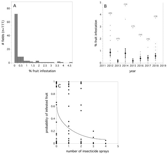 Empirical frequency distribution of fruit infestation levels (%) per field over all years (A); the percent fruit infestation in individual fields by year, small filled circles are individual field infestation rates and large filled circles are annual means (error bars are standard errors) (B); and the relationship between model estimated probabilities of infested blueberry fruit in a field and the number of insecticide applications applied. Solid line is predicted logistic regression fit (C).