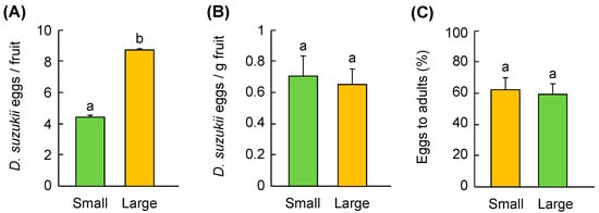 Preference by adult female D. suzukii for two different sized cherry fruit: (A) Number of eggs laid per fruit, (B) number of eggs per gram of fruit, and (C) percentage eggs developed to adults. Bars refer to mean ± SE, and different letters over the bars indicate significant difference (One-way ANOVA, p < 0.05).