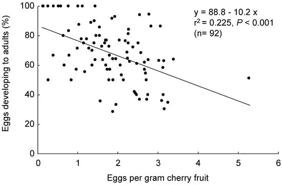 To determine the effect of D. suzukii egg density on the percentage of eggs successfully developed to adult flies, large fruit (8–9 g) of ripe ‘cv. Bing’ cherries were individually exposed to single female flies, in the cages, for different periods of time (2 h to 2 d) to manipulate the number of D. suzukii eggs laid per fruit. A total of 93 fruits were exposed with a density ranging from 1 to 43 eggs per fruit (the fruit with the extremely high density of 43 eggs was excluded from the analysis). All exposed fruit were weighed and kept in the cages until the emergence of adult flies.