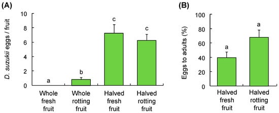 (A) Oviposition by D. suzukii on harvested citrus with different conditions and (B) percentage of eggs that developed to adults. Bars refer to mean ± SE, and different letters over the bars indicate significant difference (One-way ANOVA and Tukey’s HSD, p < 0.05).