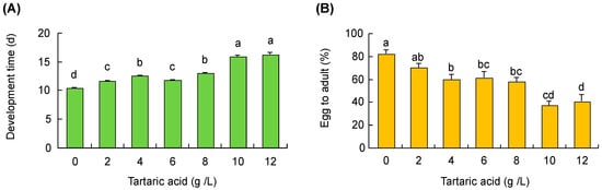 Effects of tartaric acid on (A) developmental time and (B) the offspring survival (eggs developed to adults) of D. suzukii. Bars refer to mean ± SE, and different letters over the bars indicate significant difference (One-way ANOVA and Tukey’s HSD, p < 0.05).