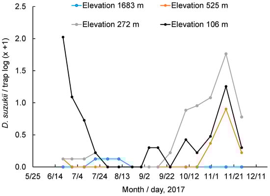The mean number of weekly captures of adult D. suzukii varied among elevations (Figure 5). At the lowest elevation where most cultivated crops were planted, there were two peaks (spring and fall), and the spring peak (104.7 ± 51.1) was higher than the fall peak (17.0 ± 7.5), but there were no captures during the hottest period of summer and dramatically lower numbers of captured flies throughout other periods of the summer. At the two middle elevations (272 and 525 m), the patterns of captured flies were similar, with a fall peak and a lower number of captured flies throughout the spring and summer. At the highest site (1683 m), no flies were captured during the spring and fall, but a few flies were captured during the hottest period of summer.